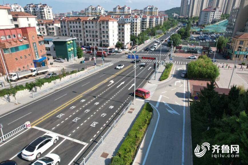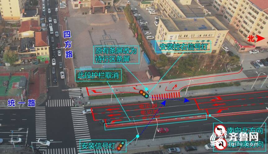 威海交警温馨提醒,威海统一南路——四方路北口施划了长待行区,待行区的标线虽然是虚线,但有明确的导向箭头,车辆需按导向箭头指示通行,不可随意变道。(来源:齐鲁网)