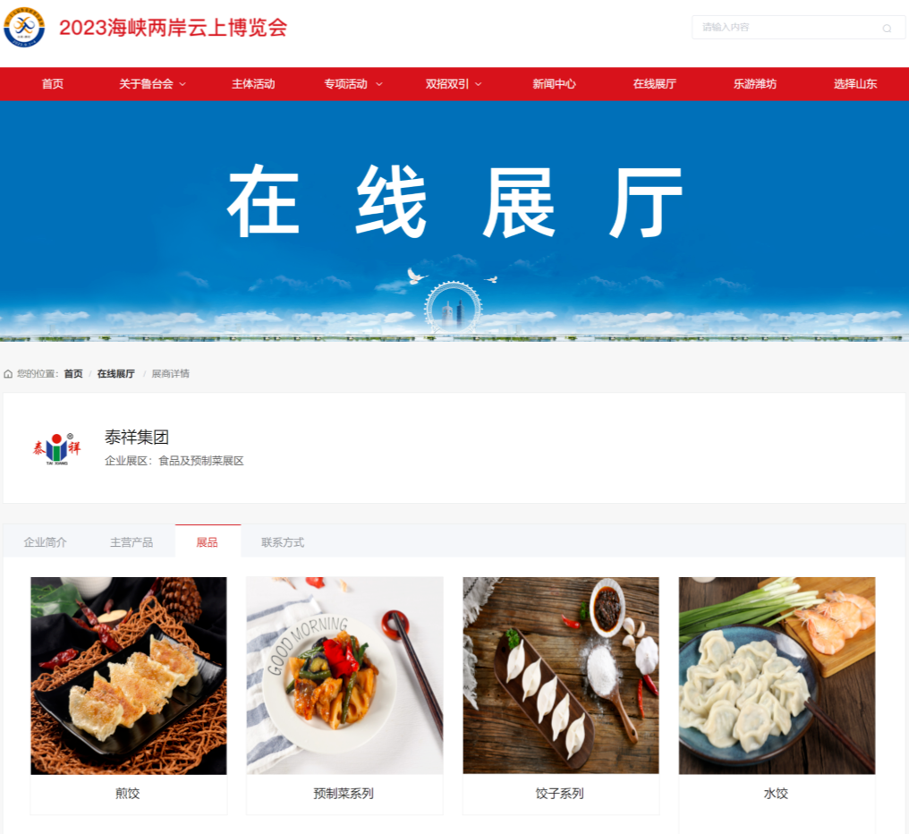 期间,作为鲁台会板块之一,海峡两岸云上博览会同期举办。为突出产业优势,推广优质产品,荣成市在云上博览会食品及预制菜展区积极推荐泰祥集团、银海水产、港泰食品等6家代表企业100余种海洋预制菜产品,受到参会企业嘉宾的广泛关注,推动“一桌最海鲜”的荣成味道香飘“云端”。