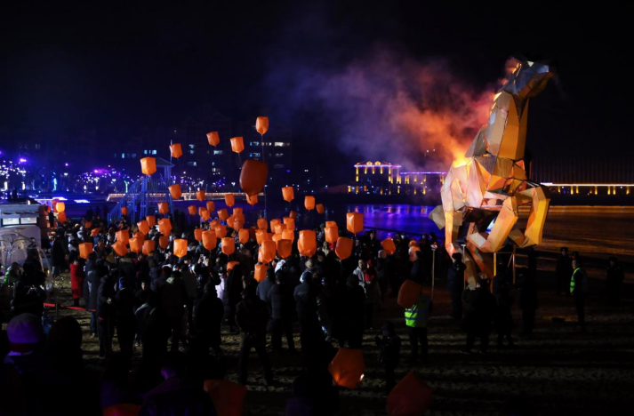 小年夜,威海半月湾,一匹由光影构成的“烈焰赤马”腾空而起,象征着对新一年的祝福和期待。